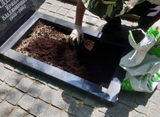 Следующим этапом было облагораживание цветников. Мы заполнили их грунтом, который сразу же опрыскали удобрениями. Это позволило практически сразу же получить зеленеющую траву на могилах.
